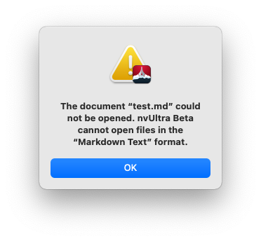 However -- this is different.  nvUltra will not open text files, because that is not what it does.  It opens folders, which can contain many types of files, including text files.  But as far as macOS is concerned, the "document type" that nvUltra opens is a folder.