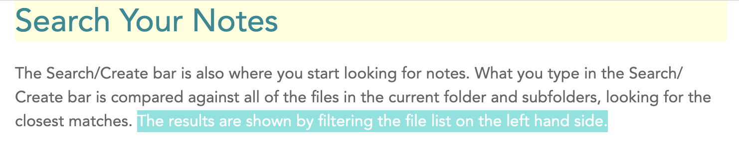 Can the help about searching notes, at https://nvultra.com/help/getting-started#searchyournotes, be updated to make it clearer that results are shown by filtering the note list? As a first-time user, reading the bit about using the up / down arrow keys made me think the search results were supposed to appear as part of the Search / Create bar.