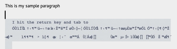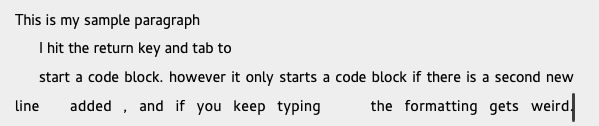 The second bug occurs when, after you have realized the code formatting is not occuring as expected you then return to the end of your written paragraph (prior to the code block) to add another new line. Once you have entered the new line the first line of the code block in the editor appears correctly, however the remaining characters turn into an encoded formatting that isn't human readable. This misformatting can be corrected if you remove the new line inserted.