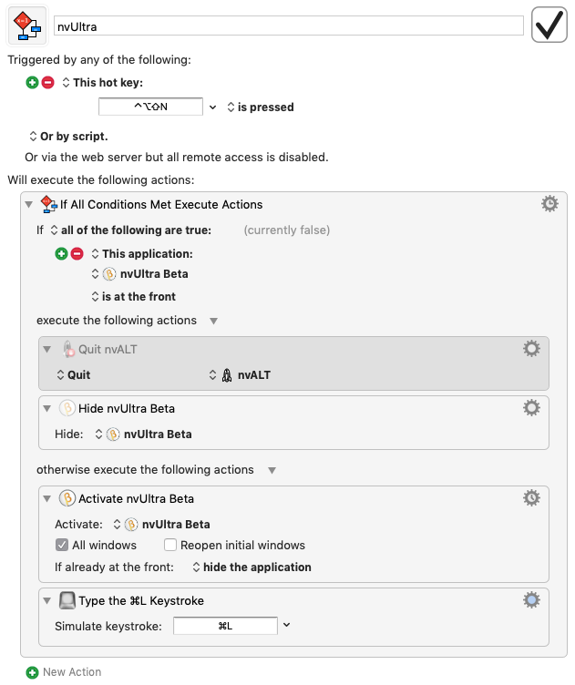 Actually I just set the keyboard shortcut in nvU, and the KM trigger takes care of the hide if nvU is in front.