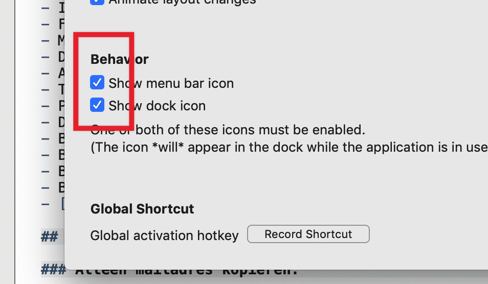the new Preverences > Behavior for Dock / menubar icons are not saved.