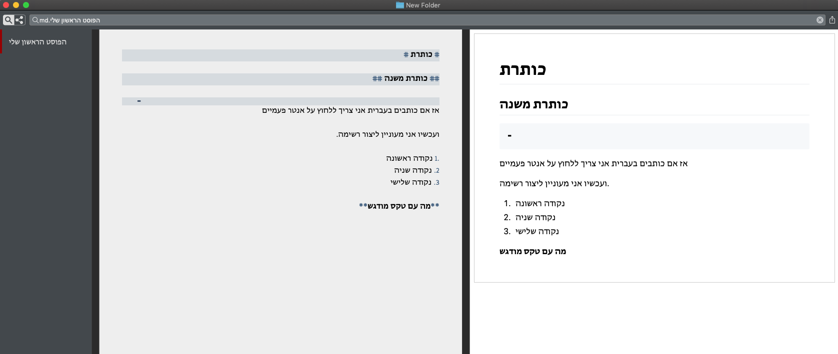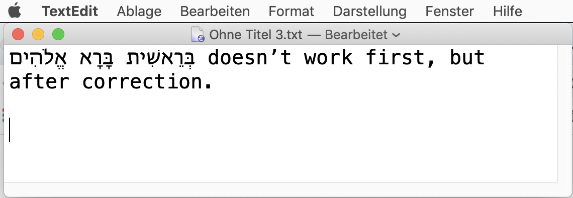5. It seems that what happens is that the file is loaded, and the macOS text engine "sees" the leading Hebrew in the body paragraph, and triggers RTL writing direction for that paragraph. Which means that the beginning of the text (which is in Hebrew) properly starts at the right side of the editor.