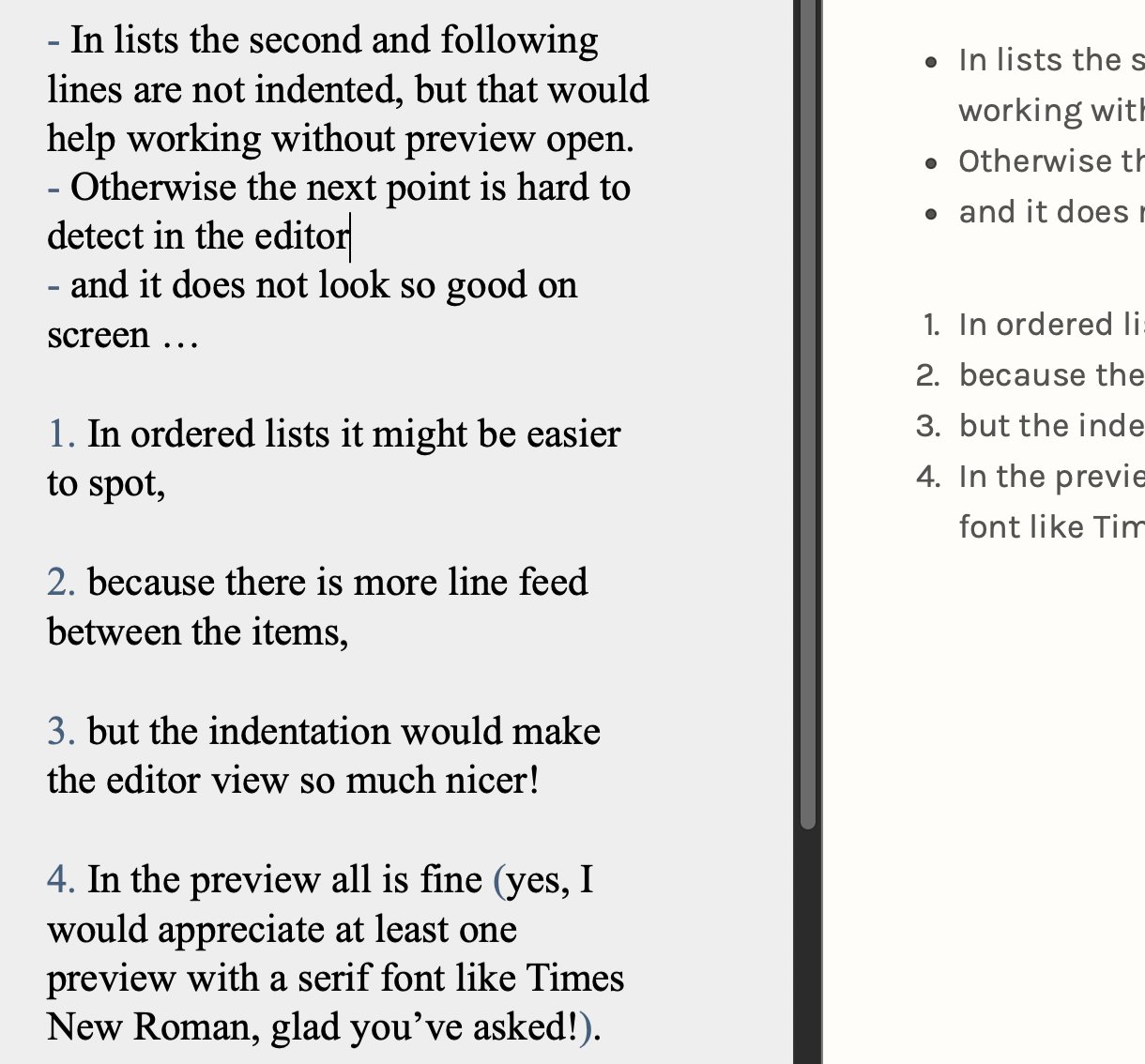 It may be a different topic, but why isn’t the list text indented in the editor?