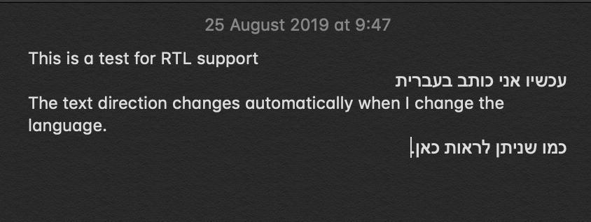 I've recorder a small video showing how the text direction changes automatically in Apple Notes when I change the language between English and Hebrew, I can share it with you view Google Drive if you want.