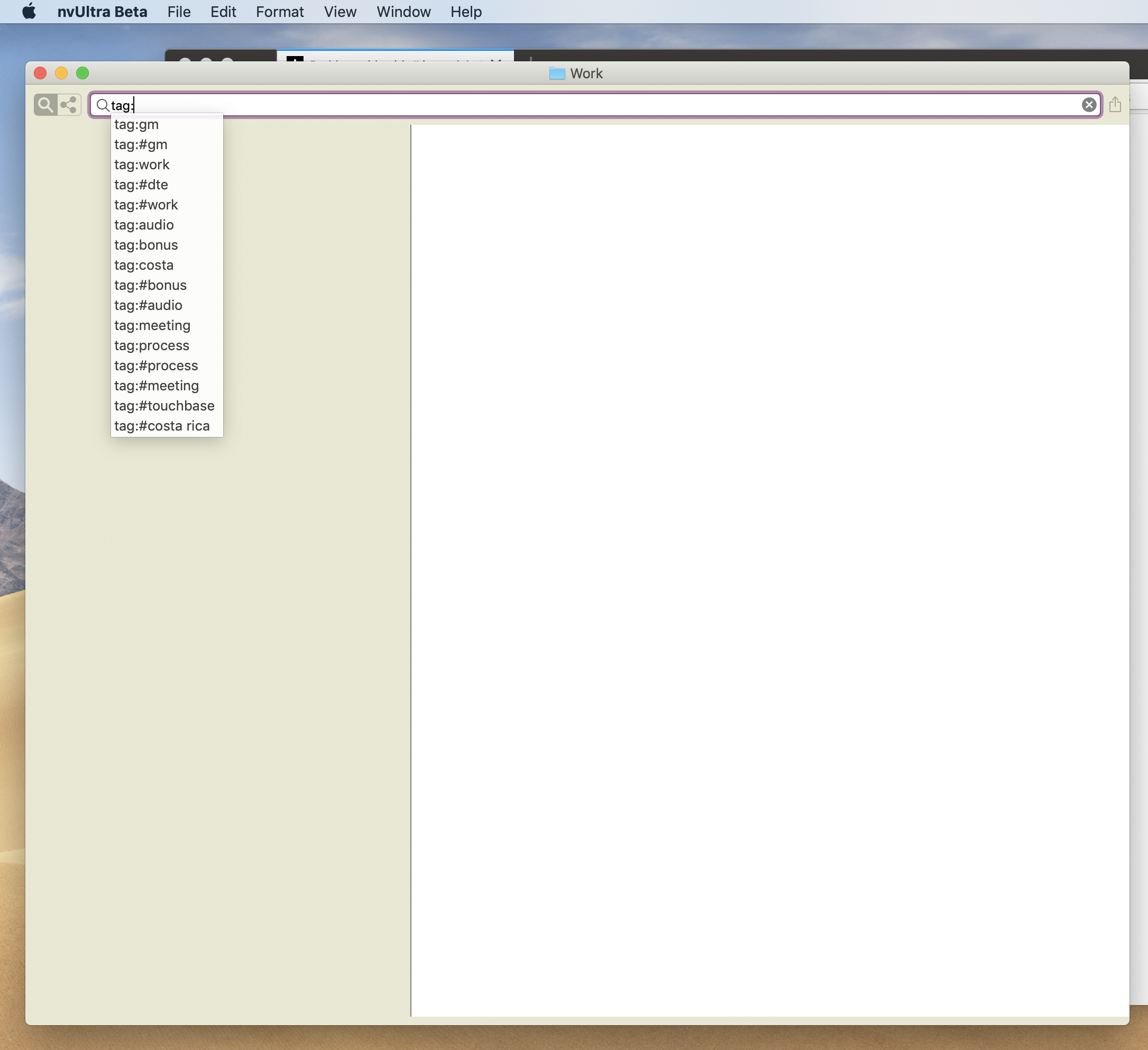 CompletedI start all my tags with #. This allows me to easily browse my tags within 1Writer on iOS. However, within nvUltra, when I search my tags I often get a result like the following, with duplicate auto-complete entries showing up, one with a #, one without. In example below, I typed "tag:out" to get this result. It makes the tag searching experience somewhat cumbersome.