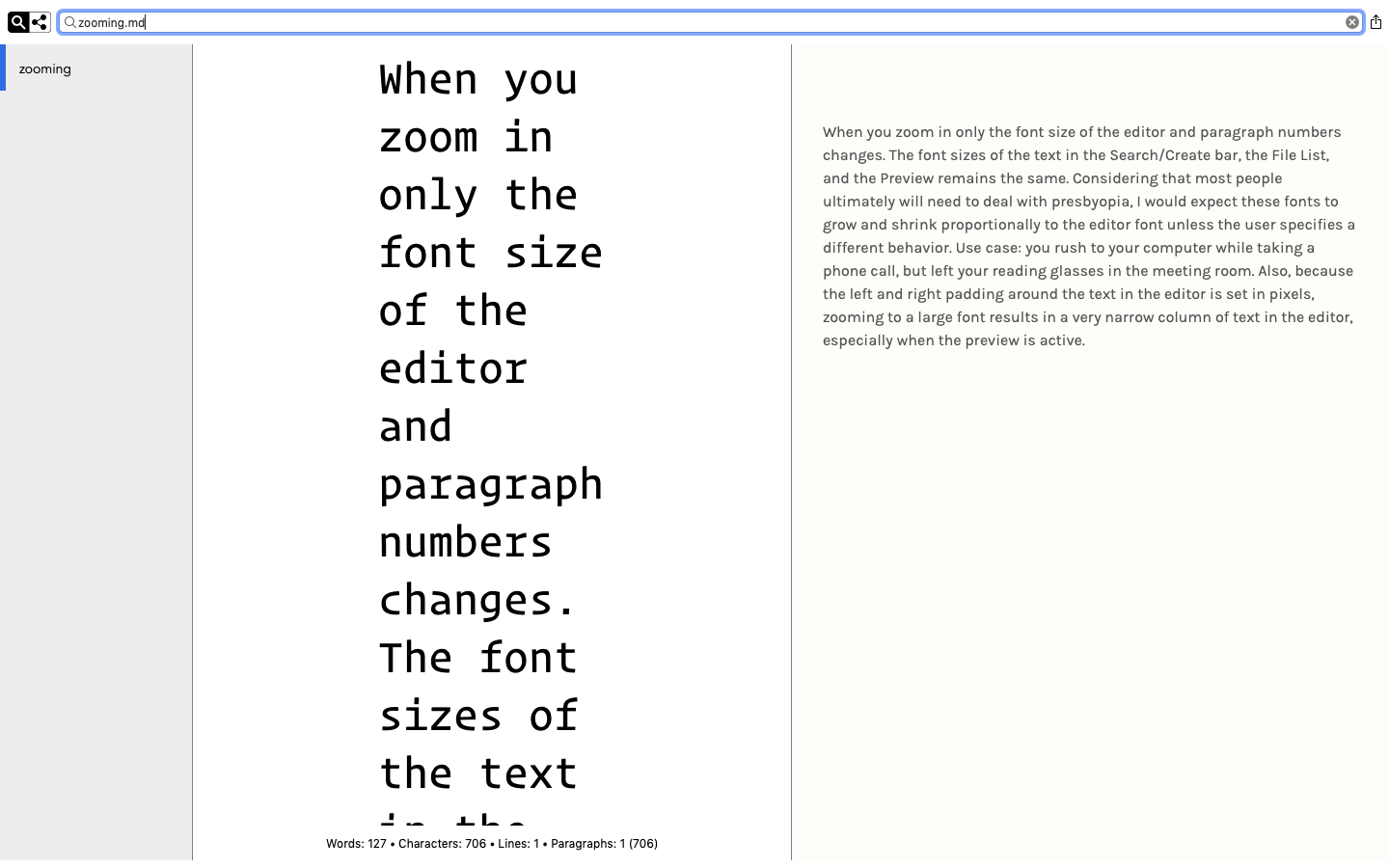 When you zoom in only the font size of the editor and paragraph numbers changes. The font sizes of the text in the Search/Create bar, the File List, and the Preview remains the same. Considering that most people ultimately will need to deal with presbyopia, I would expect these fonts to grow and shrink proportionally to the editor font unless the user specifies a different behavior. Use case: you rush to your computer while taking a phone call, but left your reading glasses in the meeting room. Also, because the left and right padding around the text in the editor is set in pixels, zooming to a large font results in a very narrow column of text in the editor, especially when the preview is active.