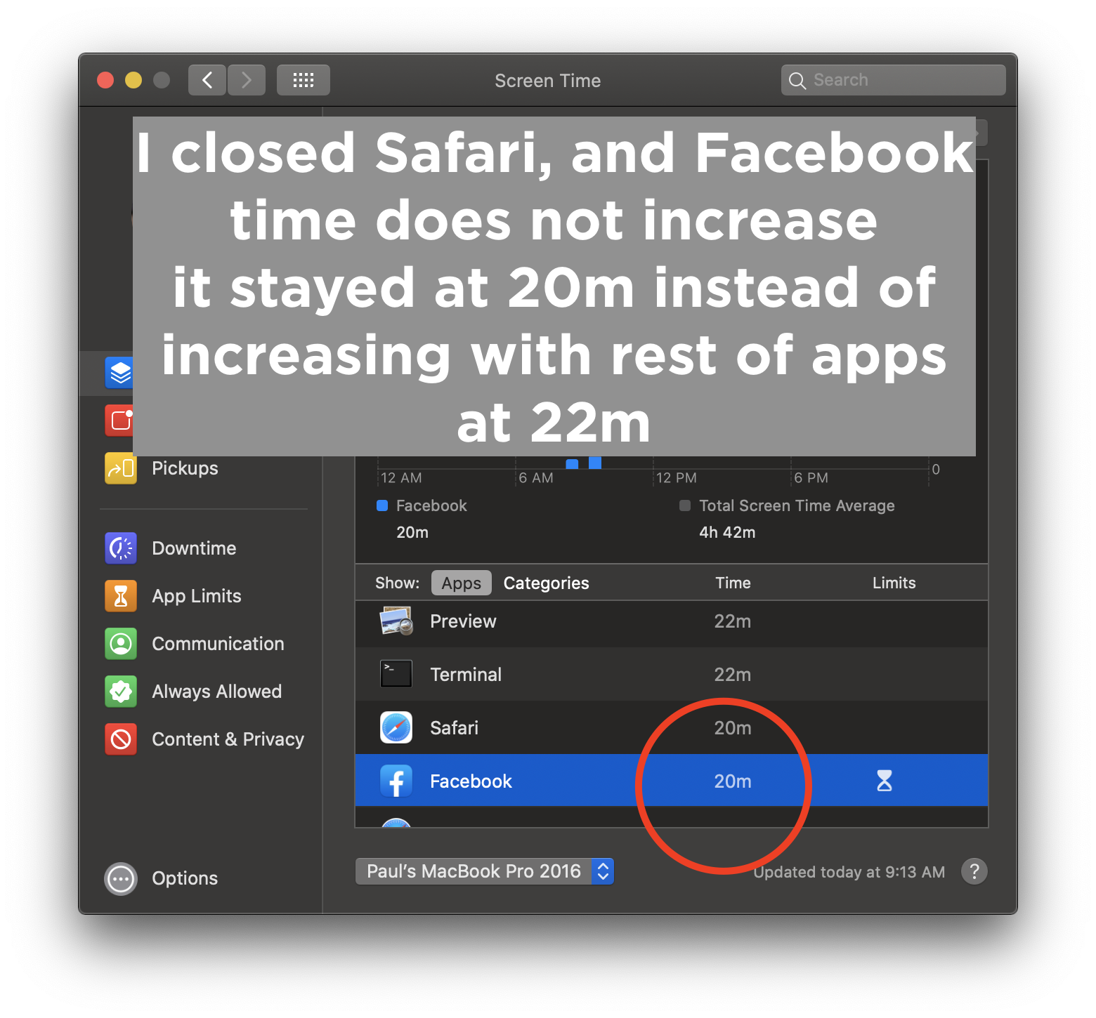 All that said, I think all apps that are open get counted as part of the screen time -- Chrome/Xcode/Messages/Thunderbird/REsilio Sync/Calendar/Sublime Text/Finder/preview/Terminal all have the exact same time listing on my computer. But I don't have Facebook listed since I never use it.0