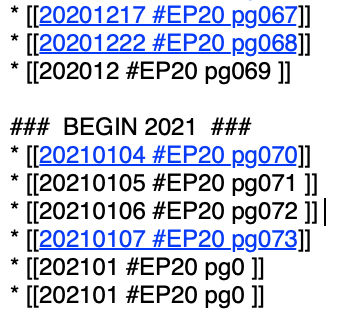 This allows me to tee up a bunch of links (in the above example, a table of contents summary note from a paper notebook called EP20) and then, activate select ones by removing the space. This results in a rendered hyperlink that I click on, thus generating the new note, which I can then complete.