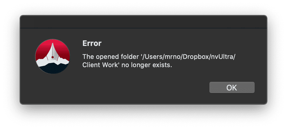 CompletedWhen I have a directory of files open in nvUltra, and then rename the corresponding folder in the Finder, nvUltra correctly updates the name of the tab, but then it also throws a pop-up error which states "Error The opened folder '/example folder/' no longer exists.