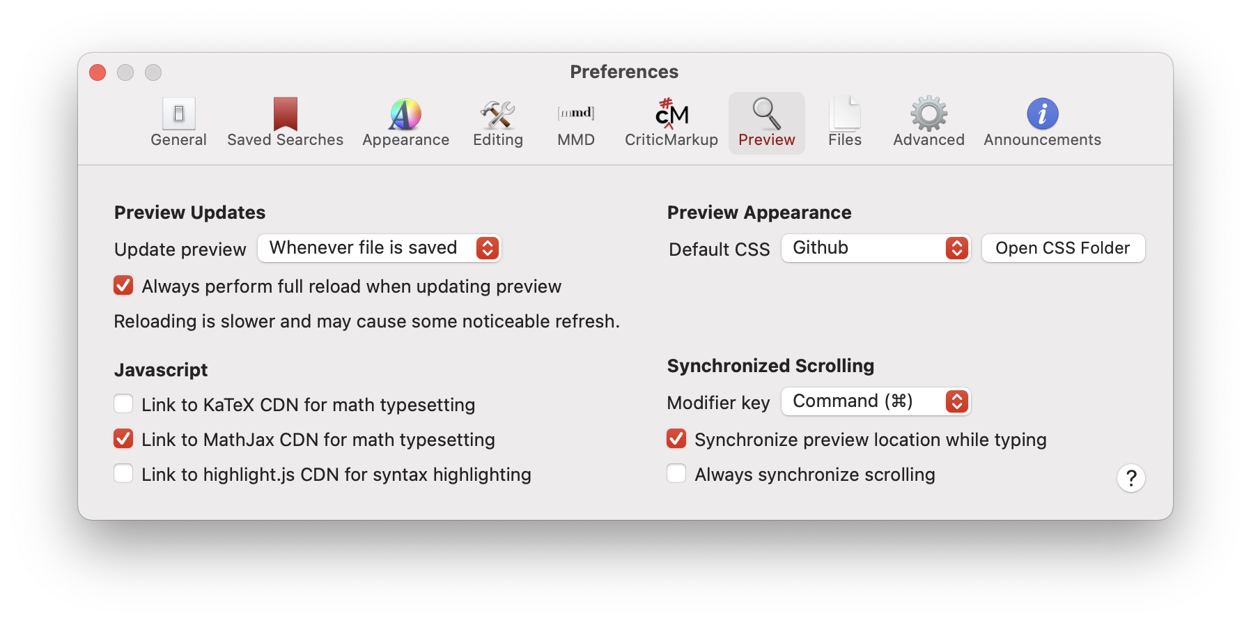 5. As you are aware, but just to note for others -- there is not really anything special about the way nvUltra links to these scripts. You can disable them and use the `HTML Header` metadata function within MultiMarkdown to use any scripts that you like (you may have to follow the reloading instructions for MathJax to get the expected behavior while typing, depending on your scripts.)