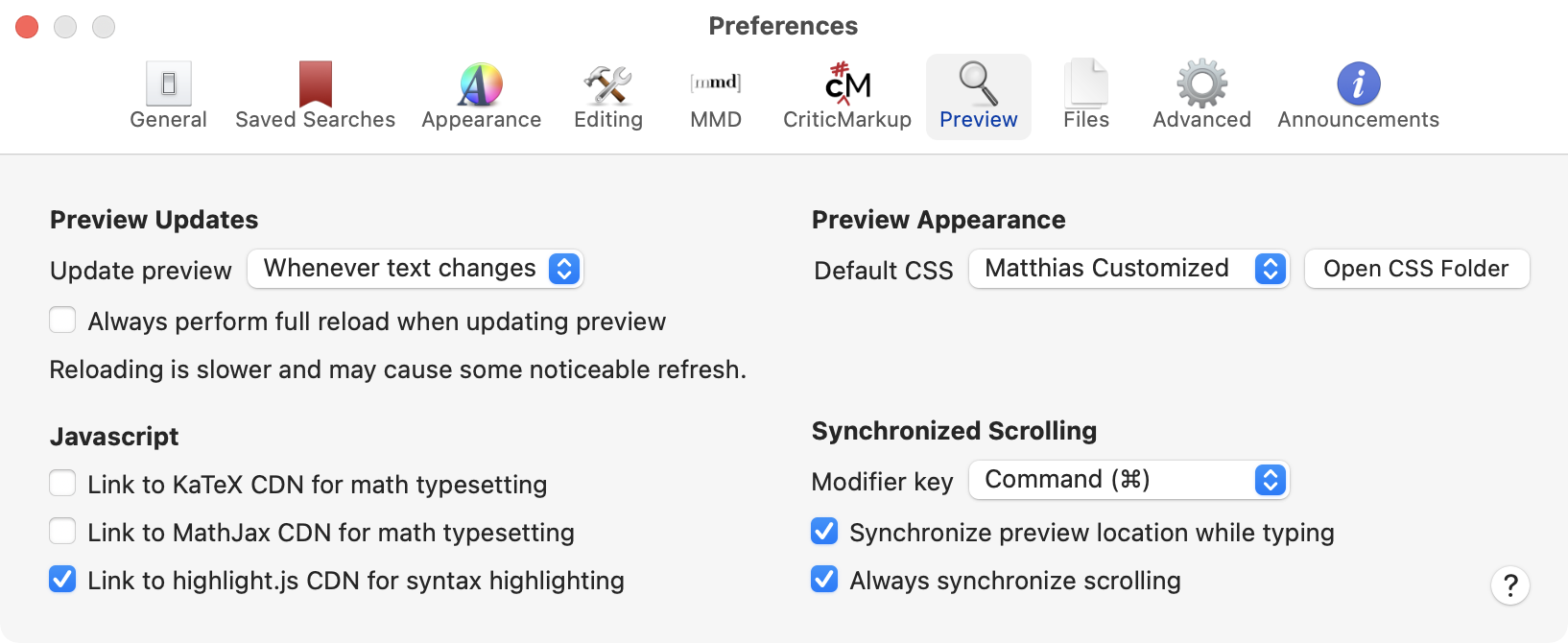What I mean by "loses CSS styling": the preview is using the browser-default font (Times) and default styling for all HTML elements, ignoring the selected preview CSS. If I try to switch to a dark-theme CSS, I can see the dark version render for a tiny fraction of a second, and then immediately be replaced by the default styling.