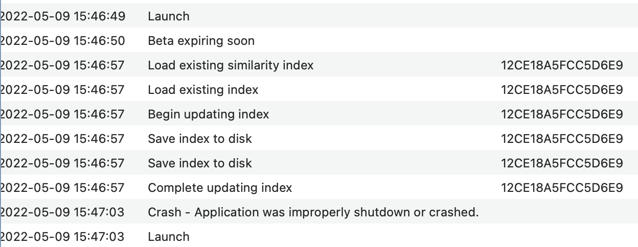 Can also use the "Open Log Folder" there and go up one level to "Caches" => nvUltra-Indexes and navigate to the relevant index file and send me that file. It will have file paths, but no file contents. I can look and try to figure out the last successful indexed file.